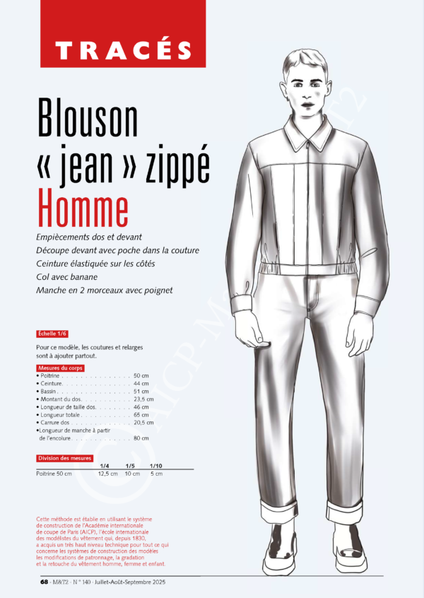 Ce tracé de blouson « jean » zippé Homme est extrait du magazine professionnel M&T2 – Modes & Techniques n°140 (juillet-août-septembre 2025).