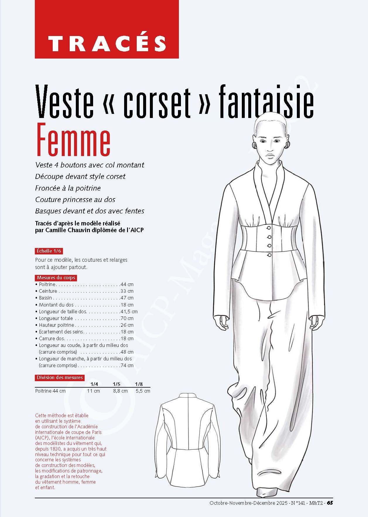 Ce tracé de veste « corset » fantaisie Femme est extrait du magazine professionnel M&T2 – Modes & Techniques n°141 (octobre-novembre-décembre 2025).